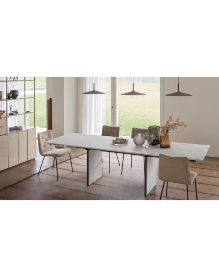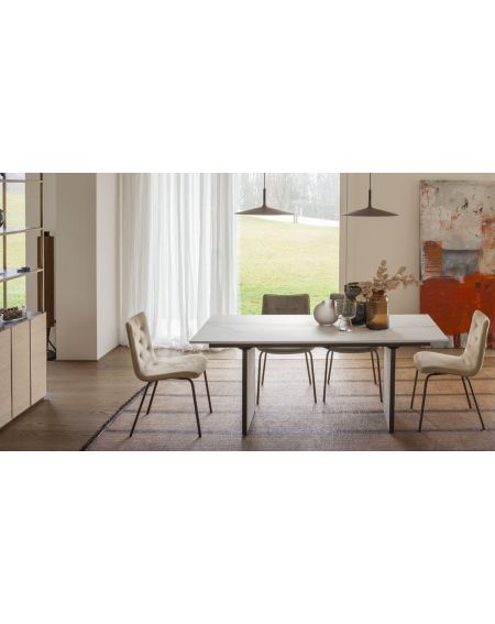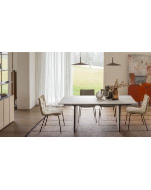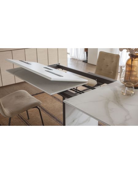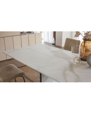 Table de repas avec 3 allonges intégrées, structure métal, plateau mélaminé ou effet-béton mécanisme télescopique